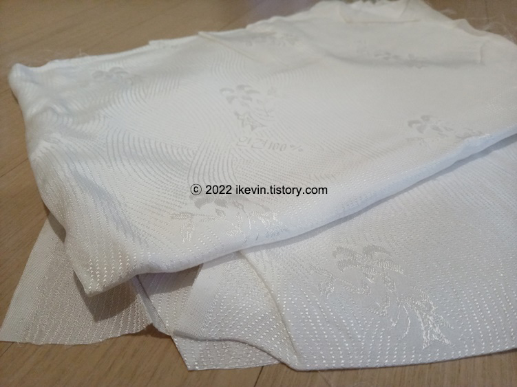 자투리 원단을 뒤져보니 예전에 유아용 인견이불을 만들고 남은 자투리가 있어서, 이것으로 결정했어요.