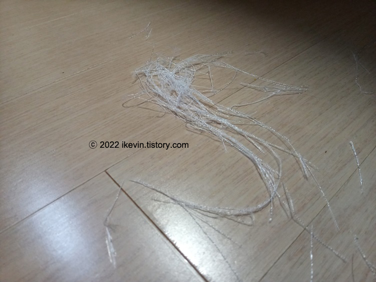 인견 원단은 재단이나 박음질 시 아래 사진과 같이, 머리카락처럼 생긴 원단 부스러기가 많이 떨어집니다.